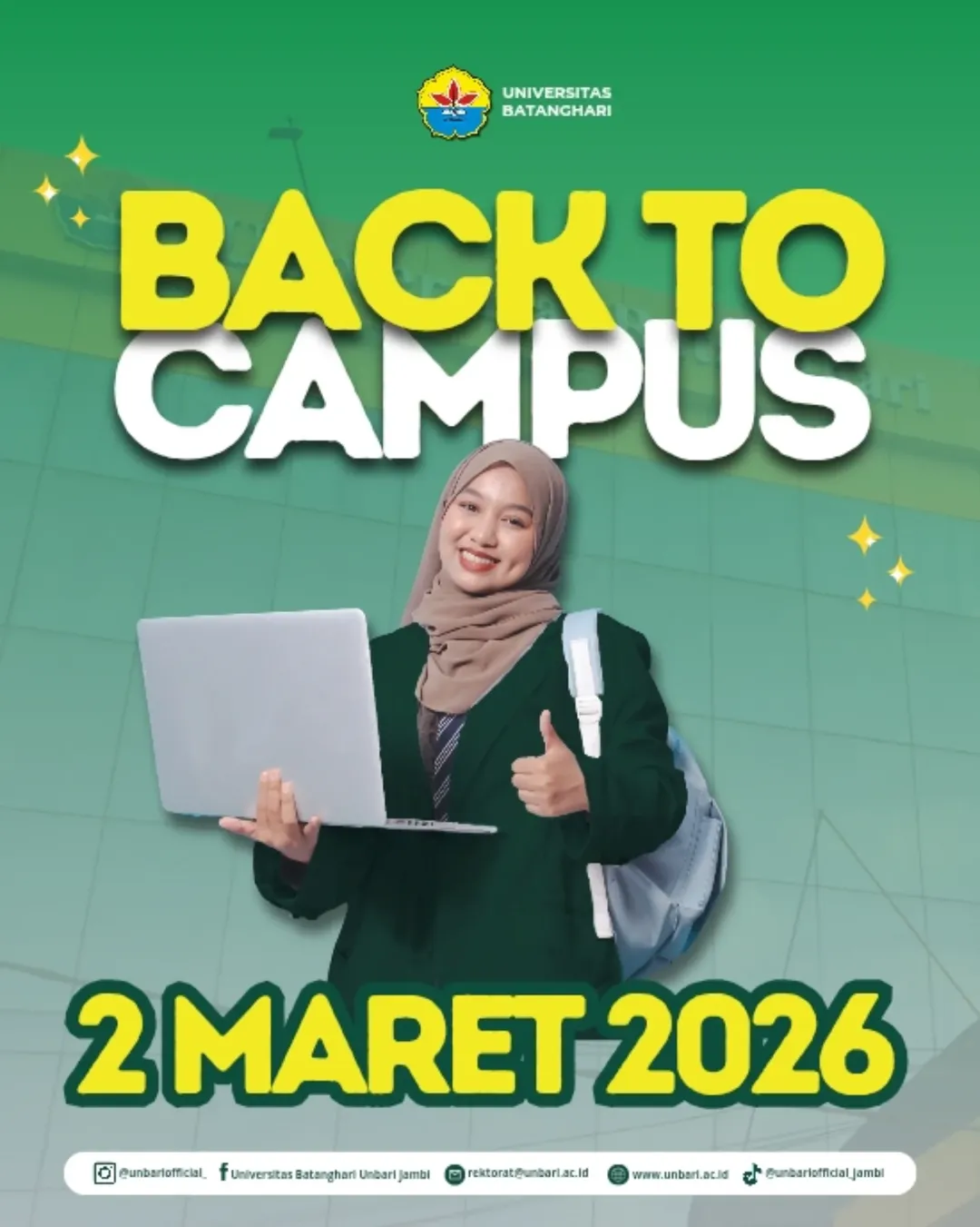 April 1, 2026 Yuk siap siap Senin 02 Maret 2026Ke Kampus lagi Btw jangan lupa segera Kontrak Matakuliahnya ya adik-adik mahasiswa Share this post Selamat Hari Raya Idul Fitri 1 Syawal 1447 H Memperingati Wafatnya Isa Al Masih Related Posts BUTUH KONSULTASI KARIR DAN PROFESI MASA DEPAN? MANFAATKAN KESEMPATAN, KUNJUNGI STAND UNBARI DI MALL JAMTOS KOTA JAMBI, MULAI 05 – 14 AGUSTUS 2022 Posted on August 6, 2022 PENGUMUMAN KELULUSAN PMB GEL III (SESI 25,26,27 dan 28) Posted on August 22, 2019 UNBARI GELAR SEMINAR INTERNASIONAL ICEST 2025 Posted on September 24, 2025