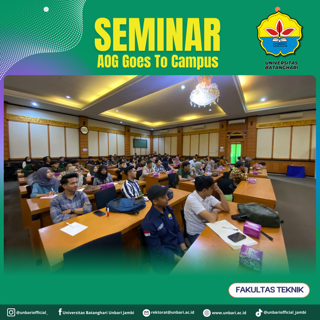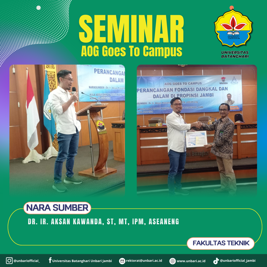 Fakultas Teknik Unbari Mengadakan Seminar untuk meningkatan Skil dan Pengetahuan Mahasiswa Fak. Teknik Unbari. SEMINAR AOG Goes To Campus dengan Tema PERANCANGAN FONDASI DANGKAL DAN DALAM DI PROVINSI JAMBI dengan Narasumber Dr. Ir. Aksan Kawanda, ST, MT, IPM, ASEANEng (Dosen Teknik Sipil FTSP Universitas Trisakti) beliau juga sebagai Ahli Geoteknik.