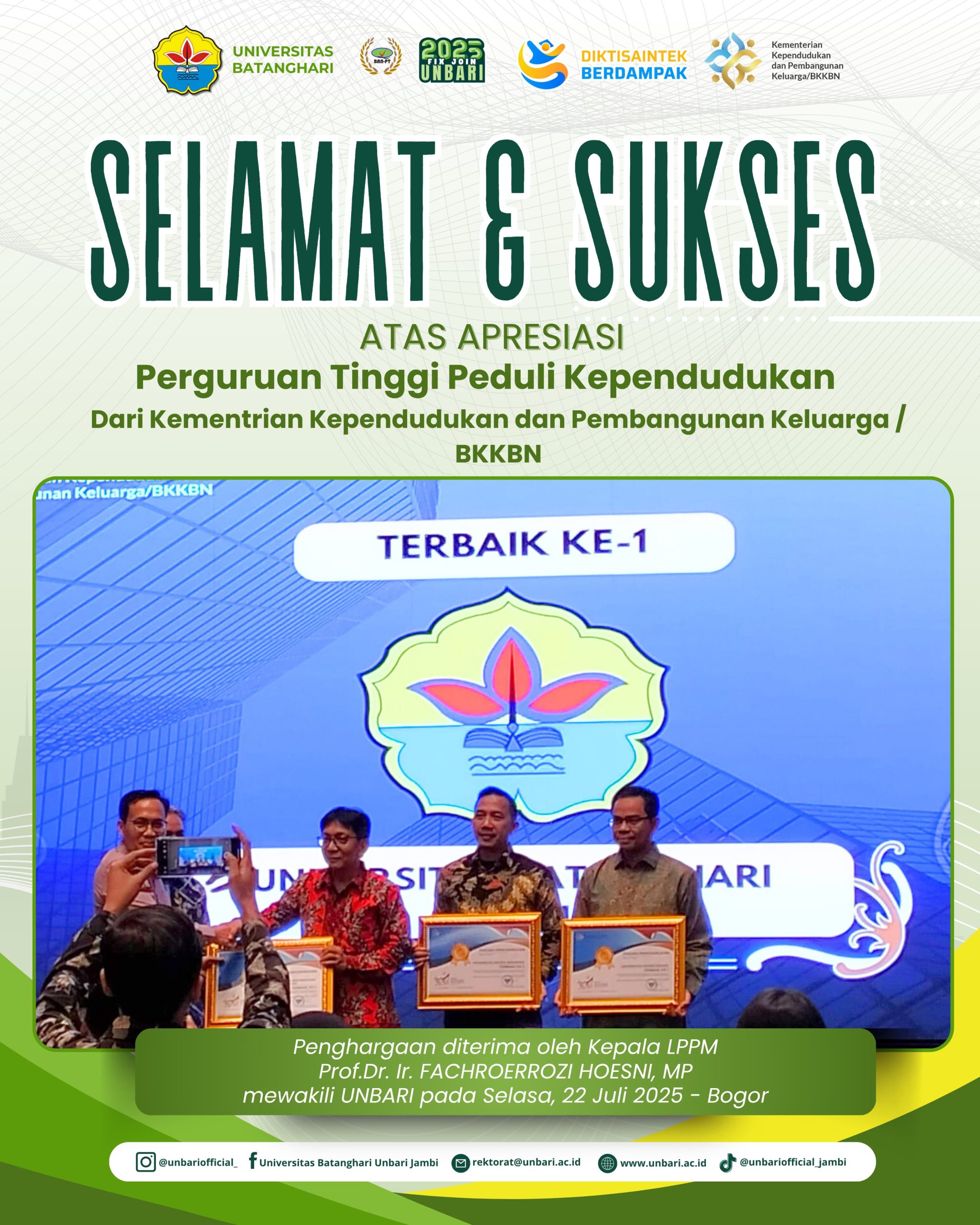 May 21, 2024 No. Referensi Bank untuk Registrasi : Akademik,Maba,mahasiswa,semester,unbari, Share this post Bimtek PPKS oleh LLDIKTI Wilayah X bagi PTS Provinsi Jambi Tahun 2024 PENGUMUMAN WISUDA UNBARI SEMESTER GANJIL TAHUN AKADEMIK 2023/2024 Related Posts SAMBUT HANGAT UNIVERSITAS PALEMBANG, UNBARI TANDATANGANI PIAGAM KERJASAMA Posted on December 23, 2024 SELAMAT & SUKSES Atas apresiasi yang didapat sebagai Perguruan Tinggi Peduli Kependudukan Dari Kementerian Kependudukan dan Pembangunan Keluarga / BKKBN Posted on July 22, 2025 UNIVERSITAS BATANGHARI (UNBARI) JAMBI DAN KEMENTERIAN LUAR NEGERI (KEMLU) RI GELAR KULIAH UMUM BERSAMA Posted on August 25, 2022