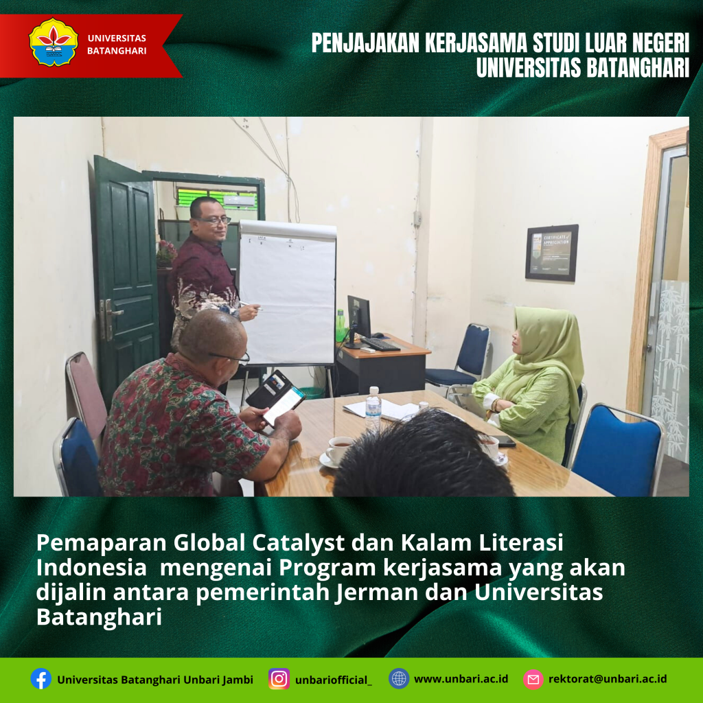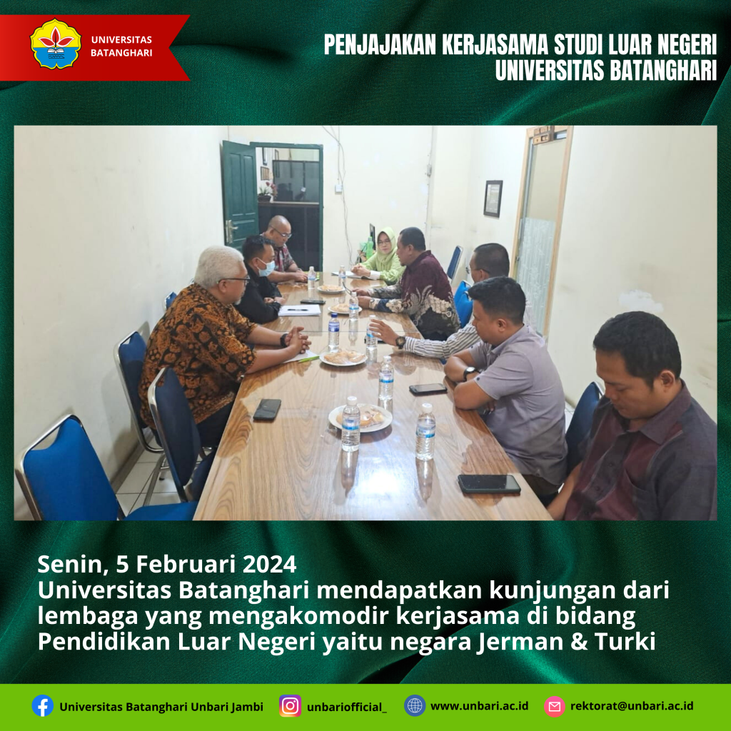 Universitas Batanghari mendapat kunjungan dari lembaga yang mengakomodi kerjasama dibidang Pendidikan Luar Negeri yaitu Negara Jerman dan Turki yaitu melalui tim Global Catalyst dan Kalam Literasi Indonesia. Hal itu juga dijelaskan dalam Pemaparan Bapak Arifin Sobari dari Global Catalyst dan Bapak Fajri dari Kalam Literasi Indonesia mengenai Pogram Kerjasama yang akan dijalain antara Pemerintah Jerman dan Universitas Batanghari.