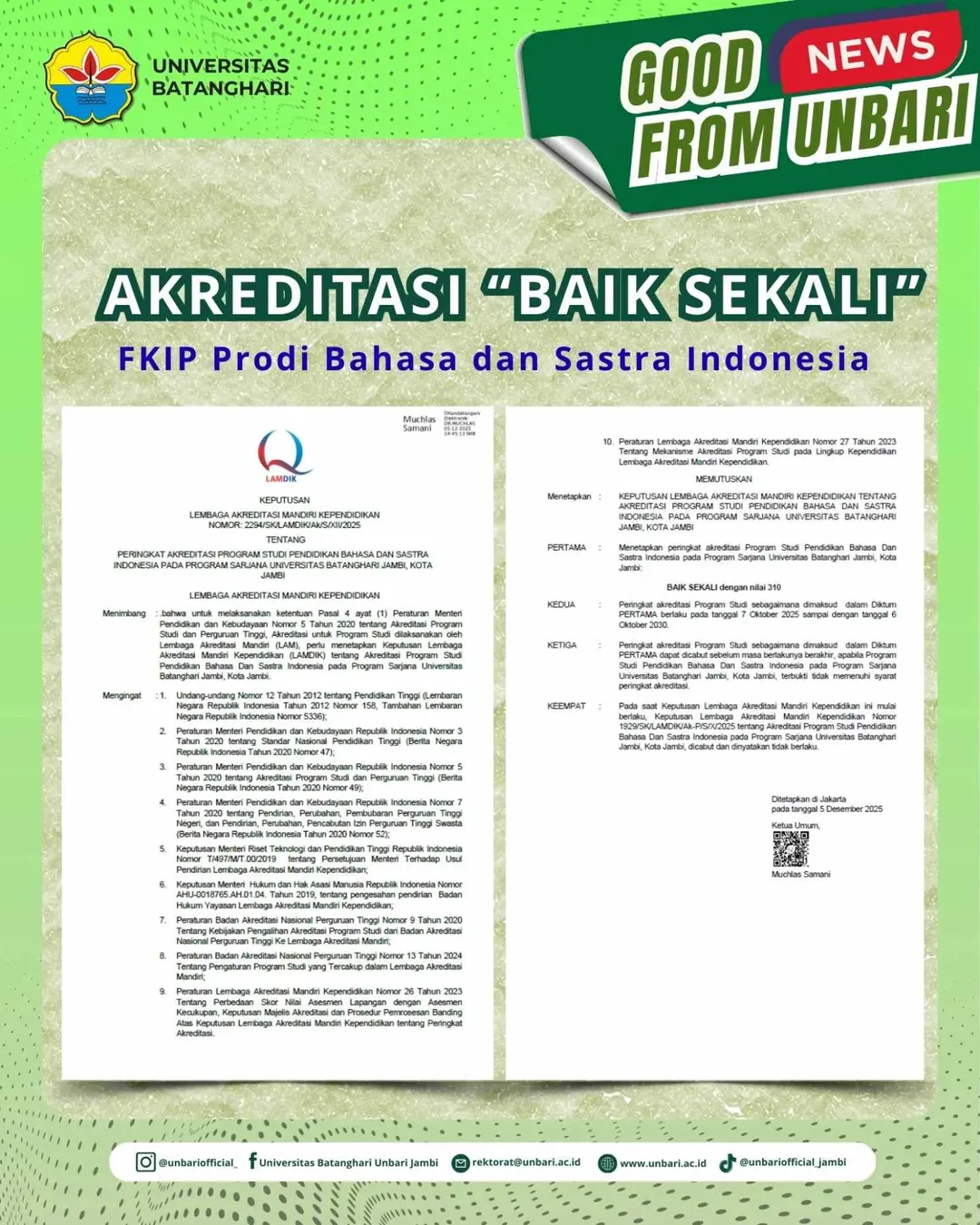 Universitas Batanghari kembali menorehkan capaian akademik melalui keberhasilan Program Studi Bahasa dan Sastra Indonesia pada Fakultas Keguruan dan Ilmu Pendidikan (FKIP) yang memperoleh peringkat akreditasi “Baik Sekali.” Pencapaian ini merupakan bentuk pengakuan resmi atas mutu penyelenggaraan pendidikan, kualitas sumber daya manusia, serta tata kelola akademik yang dilaksanakan secara berkelanjutan.