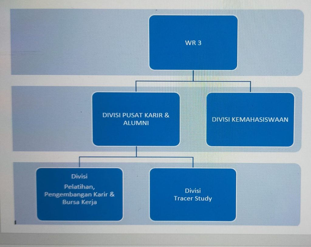 - Wakil Rektor III sebagai pengarah mempunyai tugas memberikan pengarahan dalam perencanaan, pelaksanaan, dan evaluasi program dan kegiatan di Pusat Karir