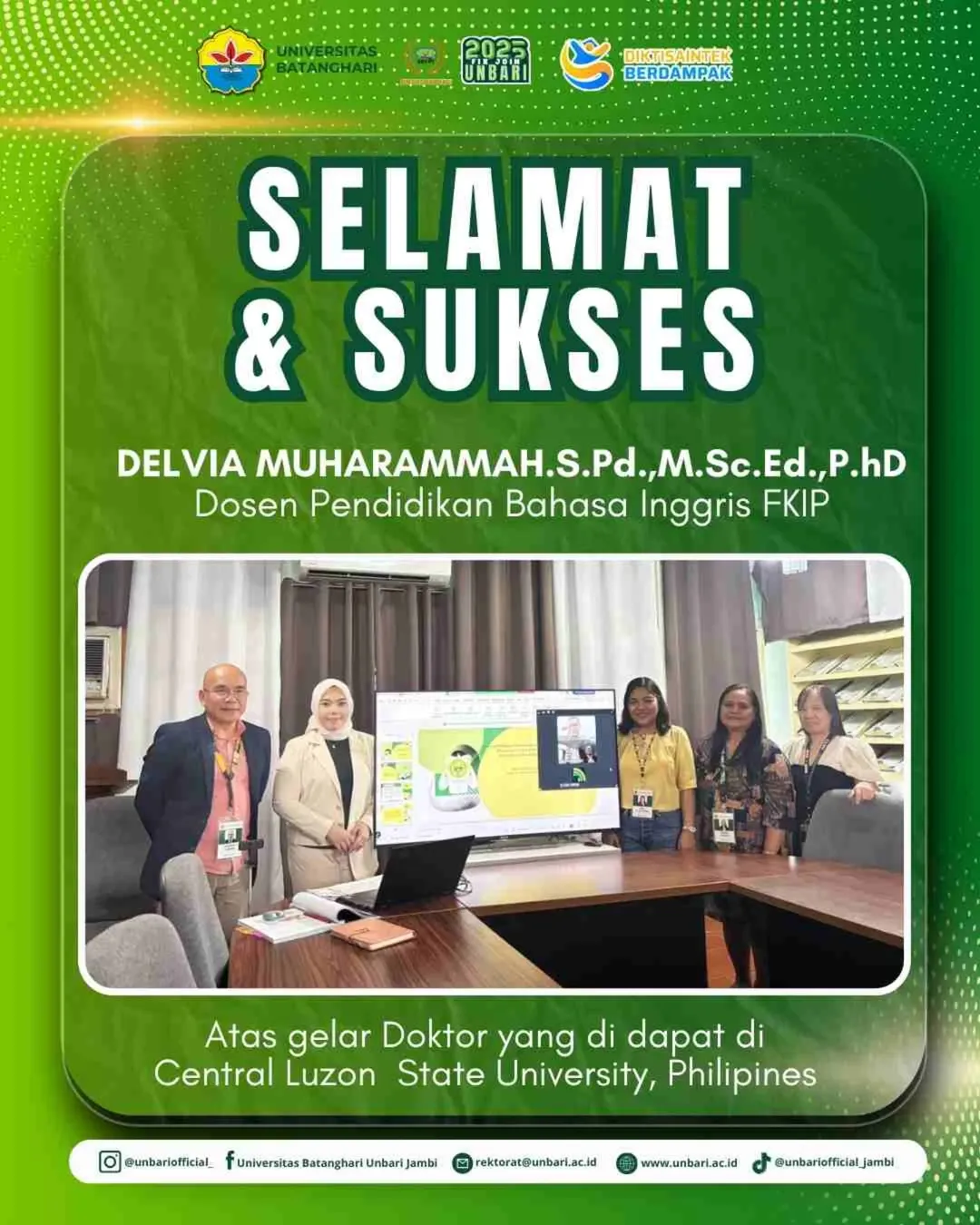 Selamat atas gelar Doktor kepada Dosen Pendidikan Bahasa Inggris FKIP “Delvia Muharramah.S.Pd.,M.Sc.Ed.,P.hD”
