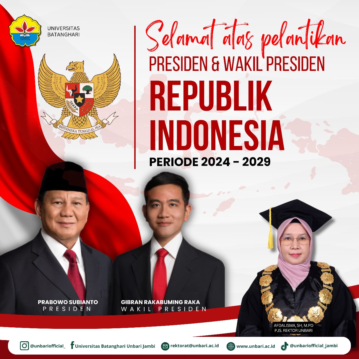 Rektor dan Segenap Sivitas Akademika Universitas Batanghari (UNBARI) Jambi mengucapkan Selamat atas Pelantikan Presiden dan Wakil Presiden Republik Indonesia Bapak H. Prabowo Subianto dan Gibran Rakabuming Raka, B.Sc. Periode Tahun 2024 – 2029
