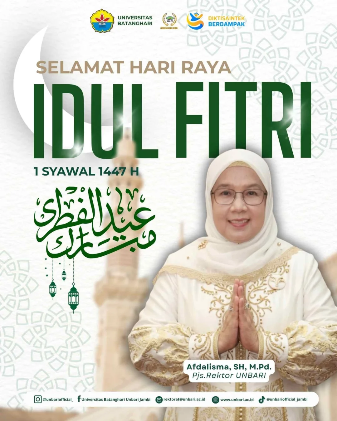 Rektor Universitas Batanghari (UNBARI) mengucapkan Selamat Hari Raya Idul Fitri 1447 H kepada seluruh Sivitas Akademika dan masyarakat. Semoga momen kemenangan ini membawa keberkahan, kedamaian, serta mempererat silaturahmi di antara kita semua.