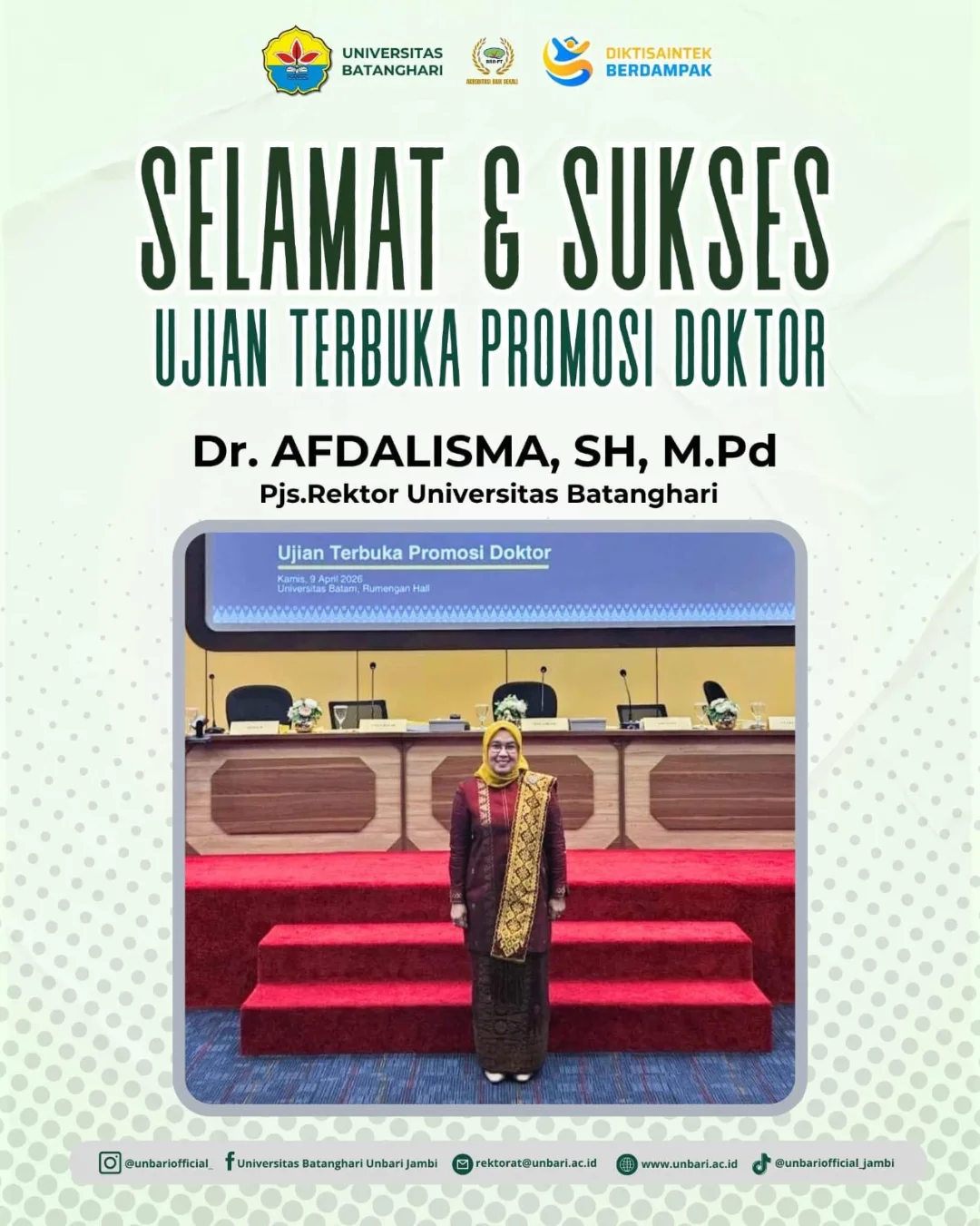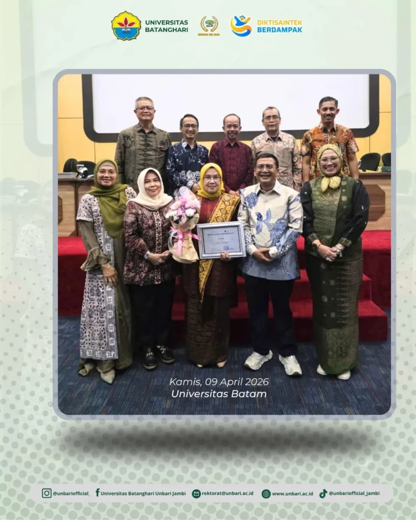 Sivitas Akademika Universitas Batanghari Mengucapkan Selamat & Sukses Kepada Ibu Dr. Afdalisma, SH, M.Pd. (Kepala LLdikti Wilayah X dan Pjs. Rektor Universitas Batanghari) dalam Ujian Terbuka Promosi Doktor yang dilaksanakan pada Kamis, 9 April 2026 di Universitas Batam.