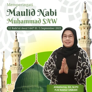 Pjs. Rektor beserta Sivitas Akademika Universitas Batanghari (UNBARI) mengucapkan selamat memperingati maulid nabi Muhammad SAW, 12 Rabiul Awal 1447 H (Jum’at, 5 September 2025). Semoga