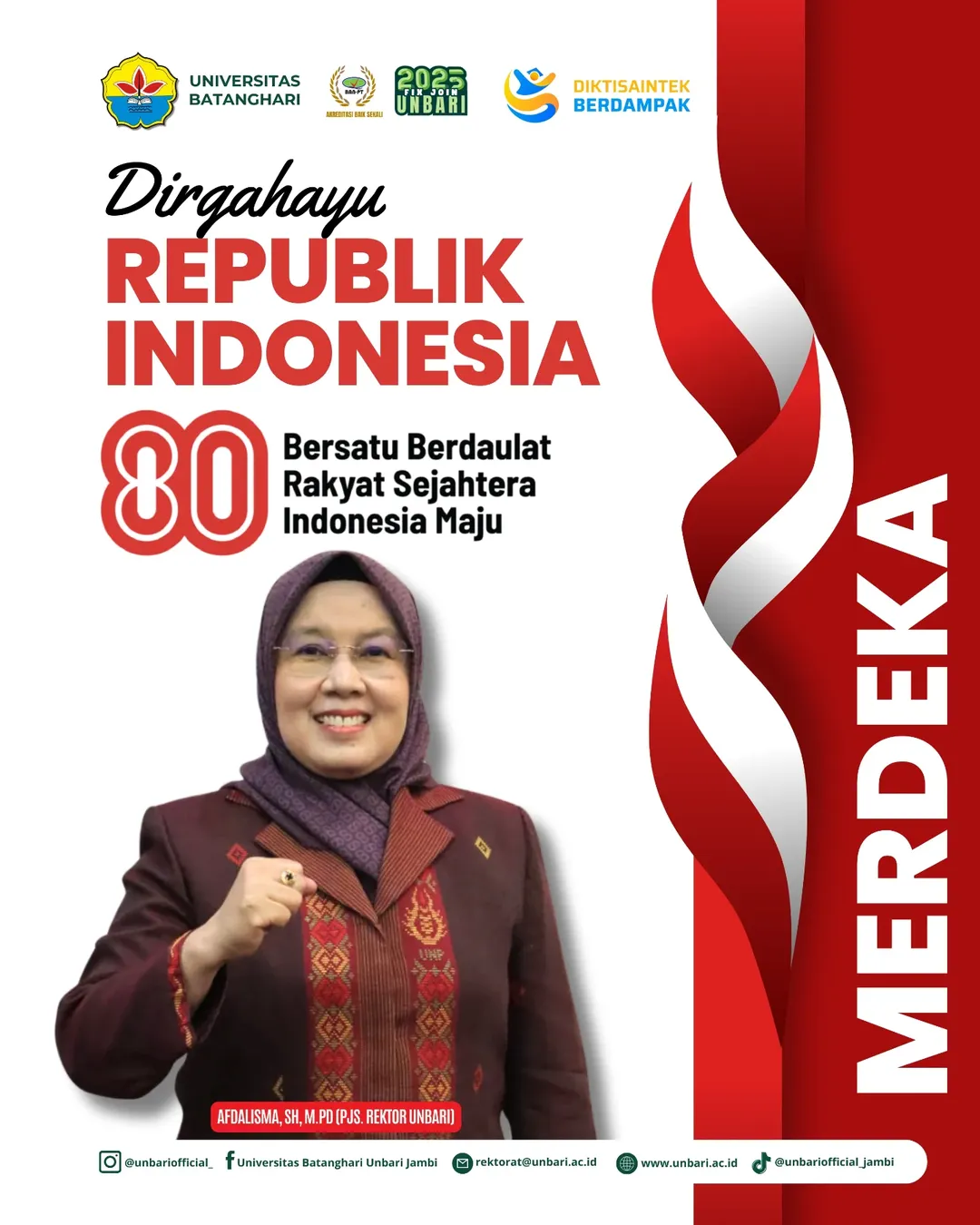 Pjs. Rektor Universitas Batanghari (UNBARI) Jambi – Ibu Afdalisma, S.H., M.Pd. dan seluruh Sivitas Akademika mengucapkan selamat ulang tahun dirgahayu Negara Kesatuan Republik Indonesia (NKRI) yang ke-80, bersatu, berdaulat, Rakyat sejahtera, Indonesia Maju