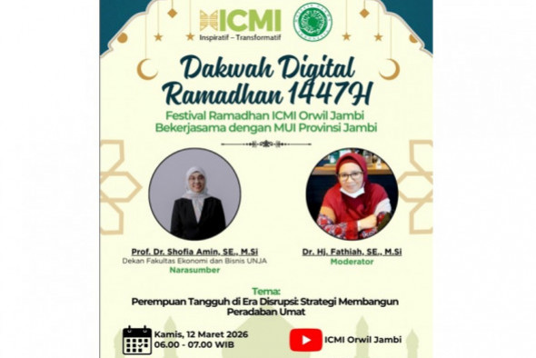 Kegiatan yang mengangkat tema “Perempuan Tangguh di Era Disrupsi: Strategi Membangun Peradaban Umat” ini menghadirkan Narasumber Prof. Dr. Shofia Amin, S.E., M.Si., Dekan Fakultas Ekonomi dan Bisnis UNJA. Diskusi berlangsung secara daring melalui Zoom pada Kamis, 12 Maret 2026, pukul 06.00 – 07.00 WIB, dan terbuka untuk masyarakat luas sebagai bagian dari Festival Ramadhan ICMI.
